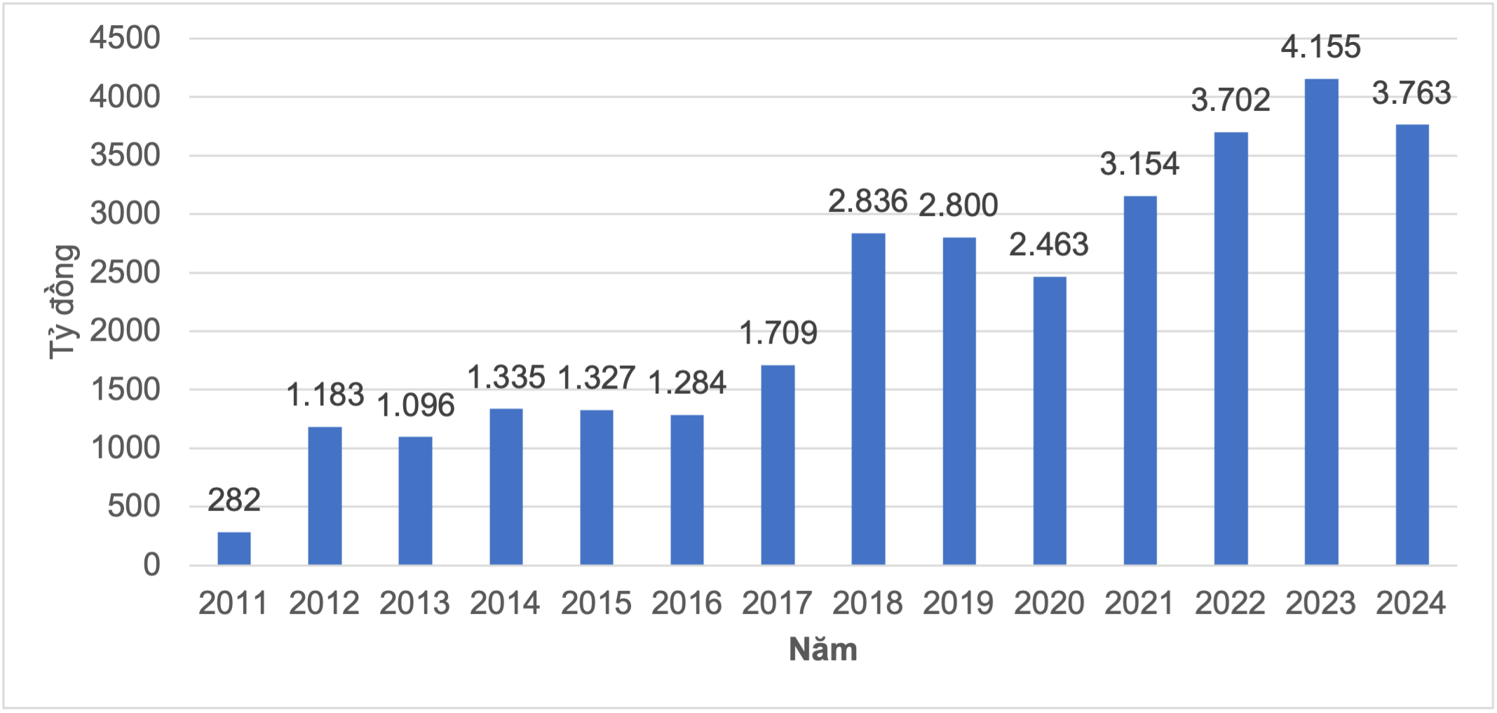 Chia sẻ lợi ích thông qua Chi trả dịch vụ môi trường rừng (DVMTR): Xu hướng doanh thu DVMTR (2011-2023) được Quỹ Bảo vệ và Phát triển rừng Việt Nam (VNFF) tổng hợp hàng năm.[1] Bộ Nông nghiệp và Môi trường (2025) báo cáo Kết quả thực hiện Chương trình phát triển lâm nghiệp bền vững giai đoạn 2021-2025.[2] và Hình B2.3.3 dưới đây cho thấy sự gia tăng đáng kể về doanh thu kể từ năm 2011: